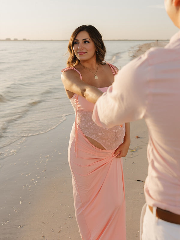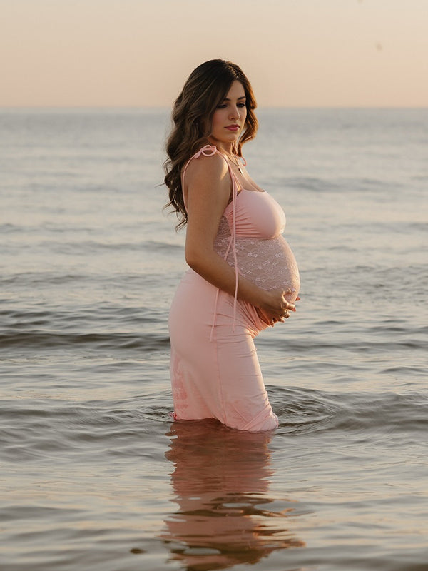 Momyknows Pink Lace Patchwork Ruched Tie Shoulder Starp Maternity Maxi Dress