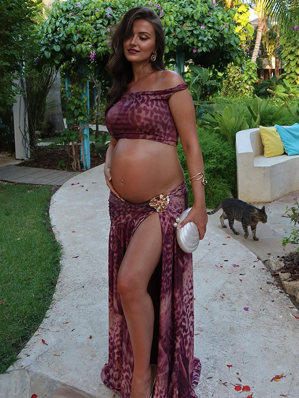 Momyknows Printed Off Shoulder Crop Mental Buckle Ruched Side Slit Maternity Maxi Dress