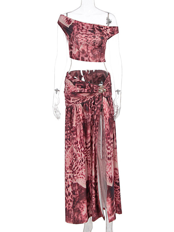 Decoration: Printed, crop, mental buckle, ruched, side slit, two piece set