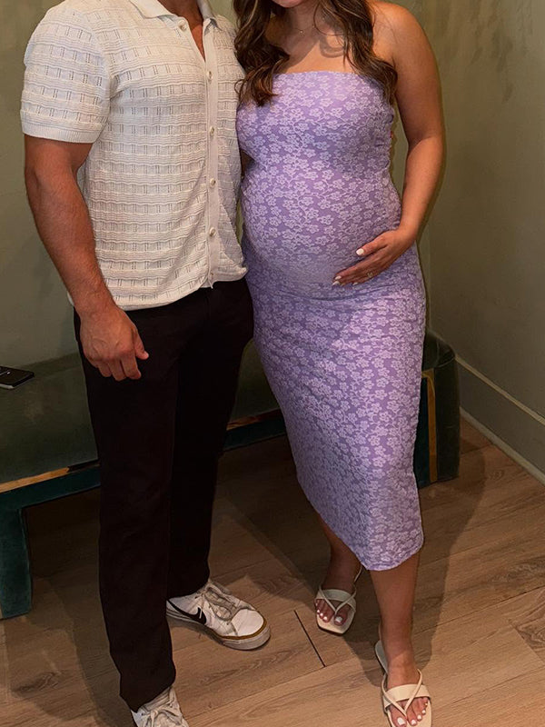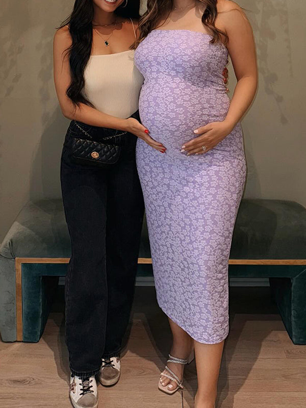 Momyknows Violet Floral Bandeau Ruched Strapless Bodycon Maternity Maxi Dress