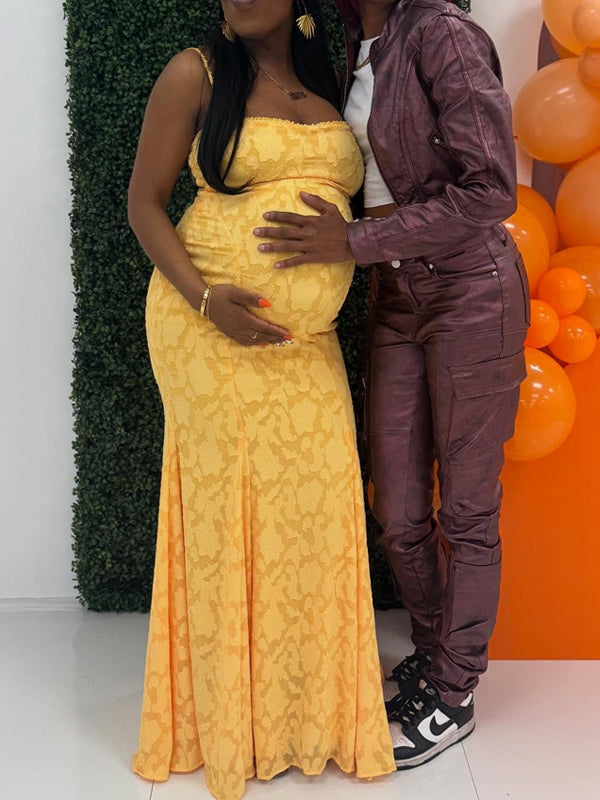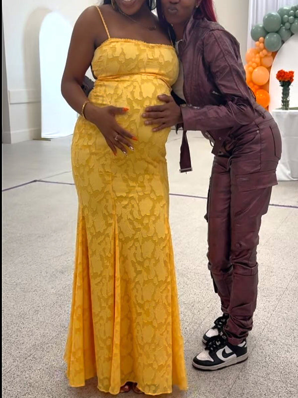 Momyknows Yellow Spaghetti Strap Lace Trumpet Maternity Baby Shower Maxi Dress