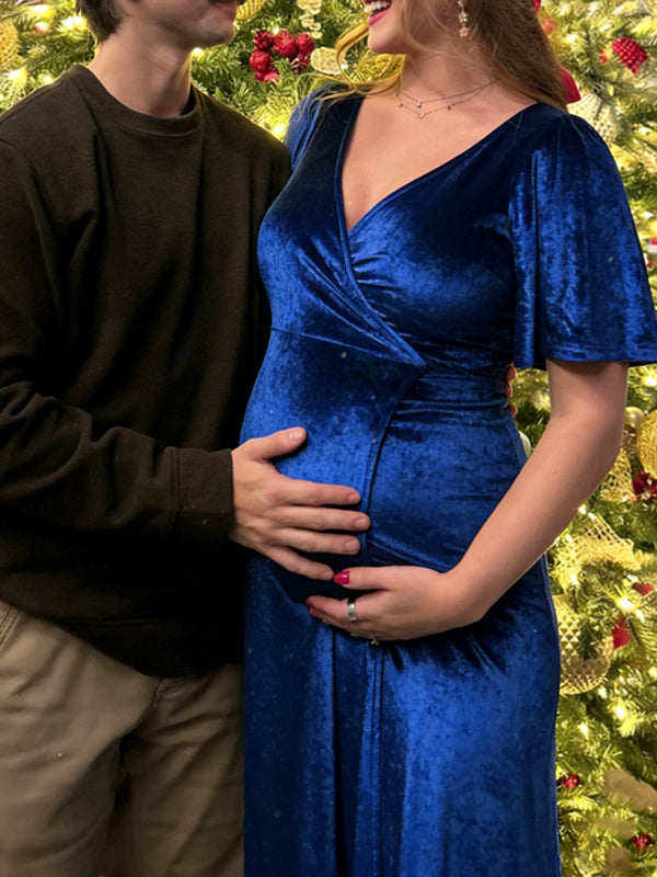 Momyknows Blue V Neck Side Slit Charm Maternity Photoshoot Maxi Dress