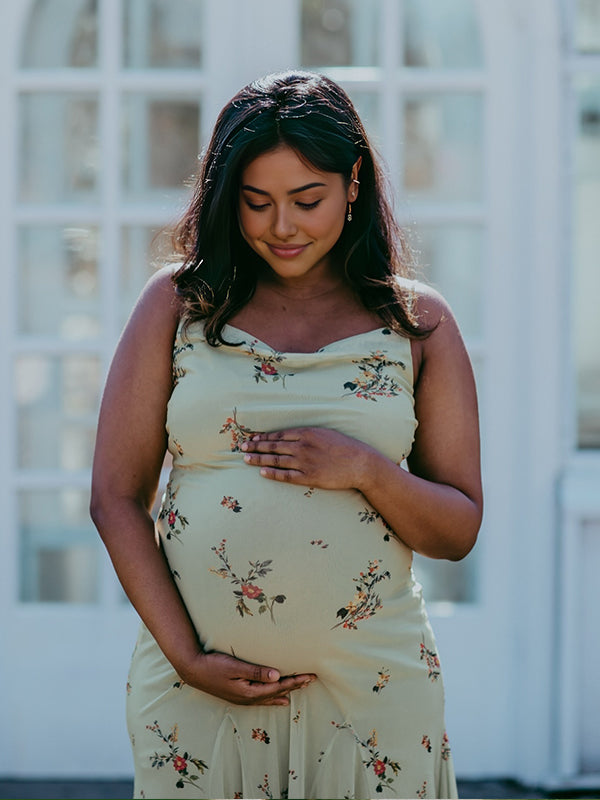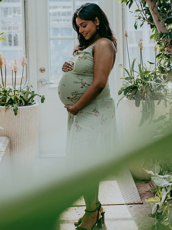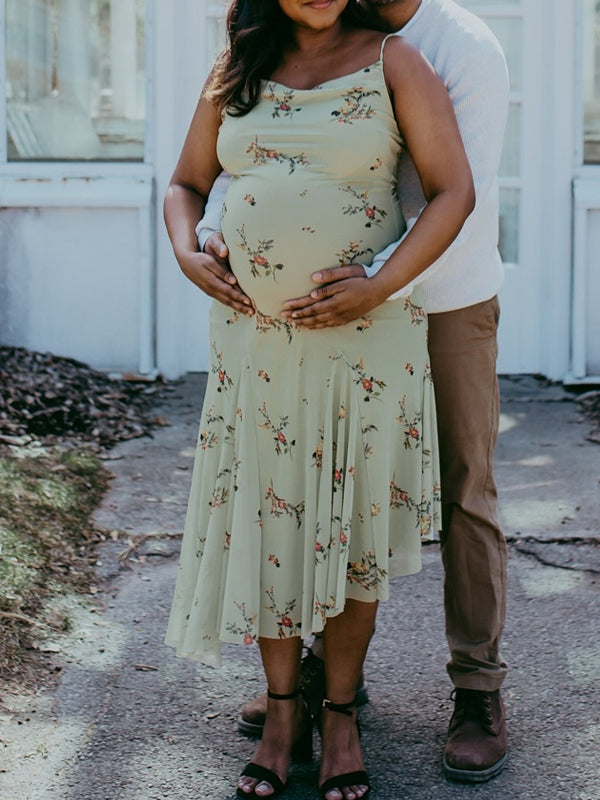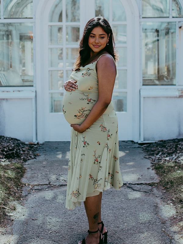 Momyknows Green Print Irregular Ruched Maternity Photoshoot Midi Dress