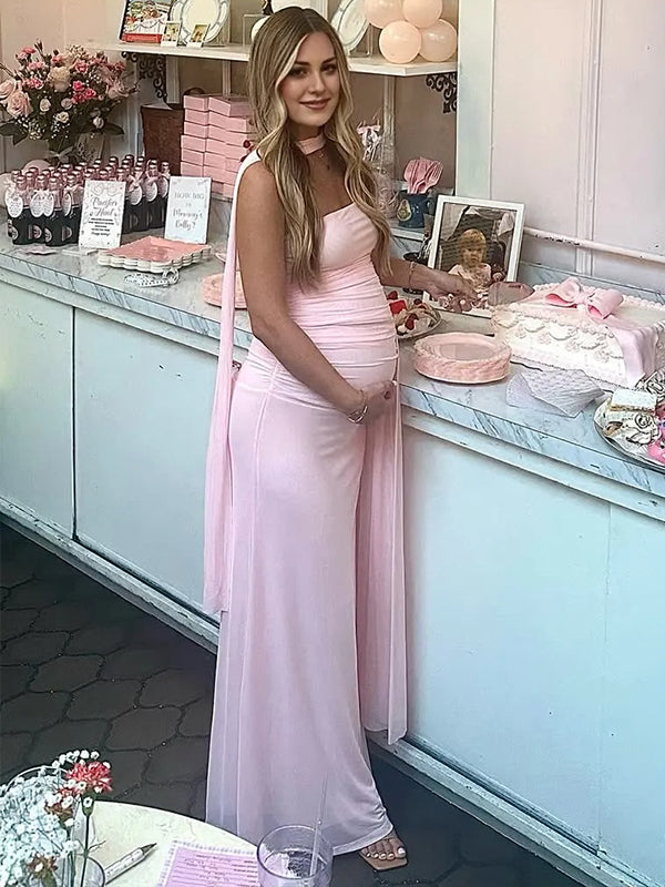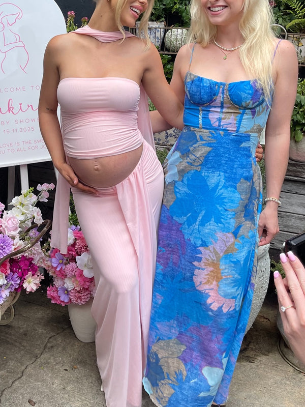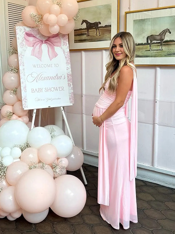 Momyknows Pink Mesh Ruched Bandeau Crop Draped Two Piece Set Maternity Maxi Dress