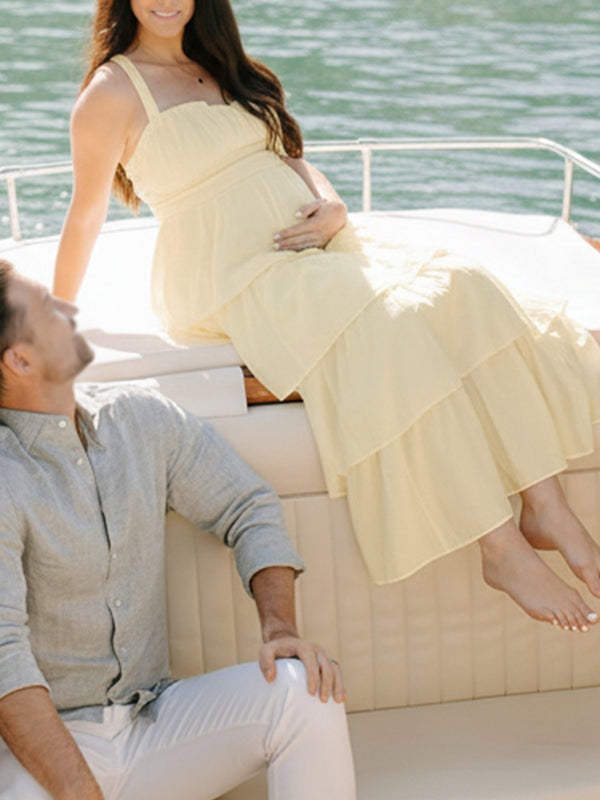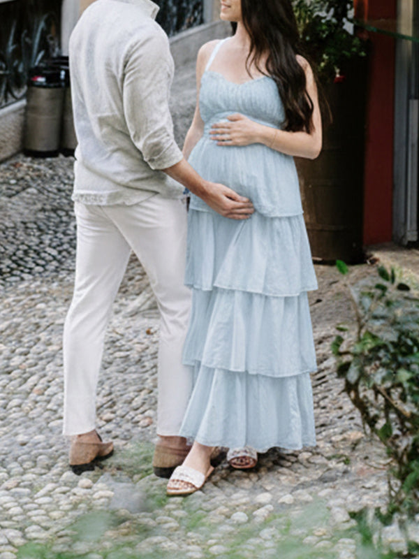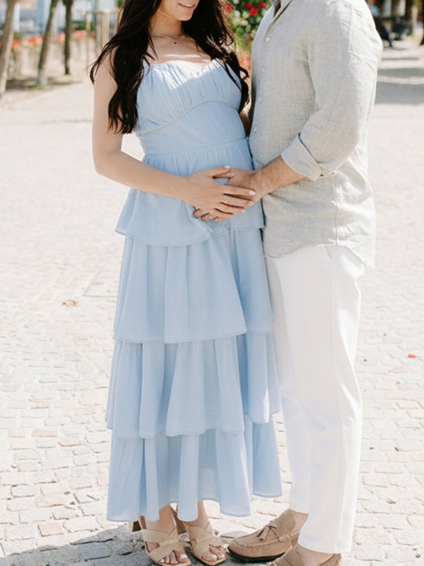 Momyknows Tiered Ruffle Tie Back A-line Tank Elegant Maternity Maxi Dress