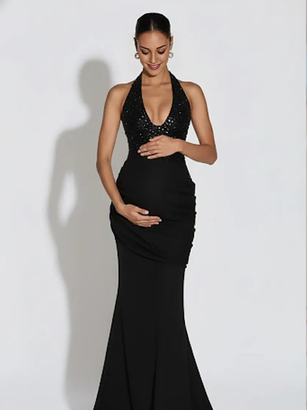 Momyknows Sparkle Sequin Patchwork Ruched Backless Mermaid Maternity Maxi Dress