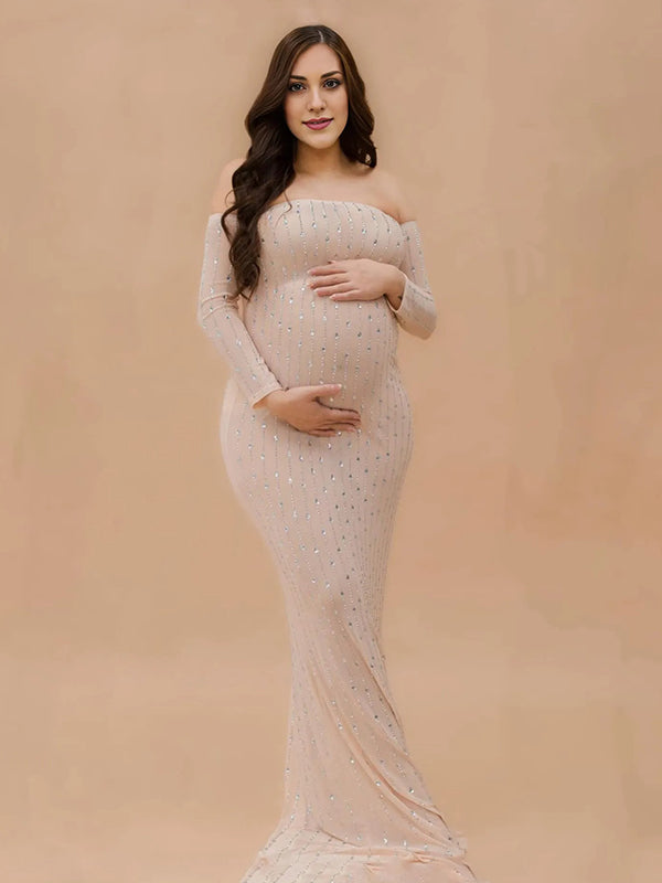 Momyknows Mesh Rhinestone Diamonds Off Shoulder Back Slit Bodycon Maternity Maxi Dress