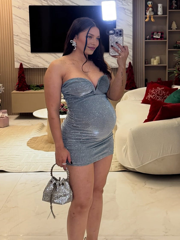 Momyknows Blue Glitter Ruched Backless Maternity Baby Shower Christmas Santa Mini Dress