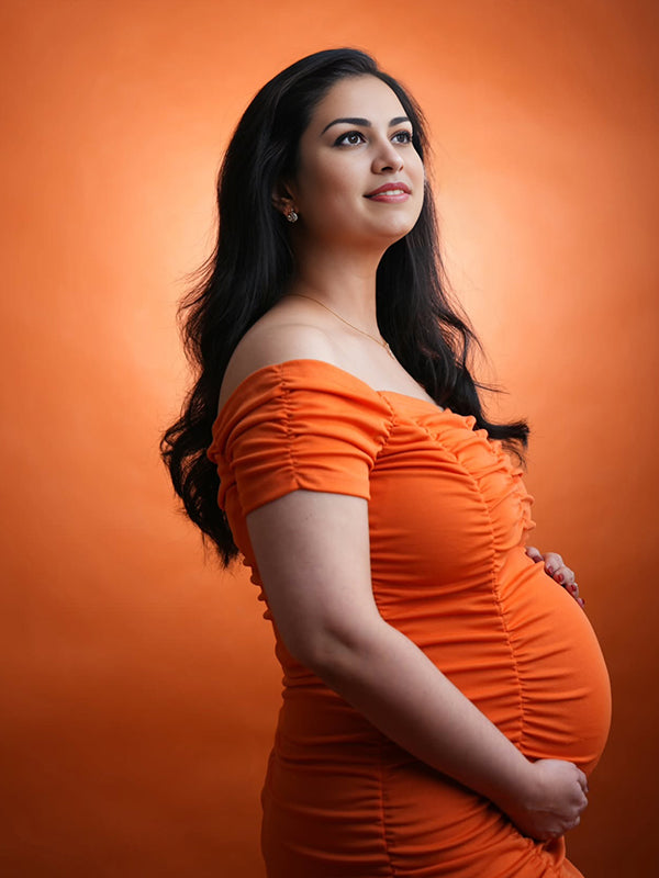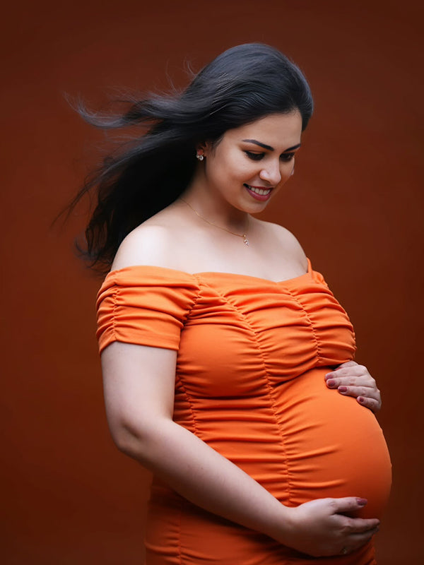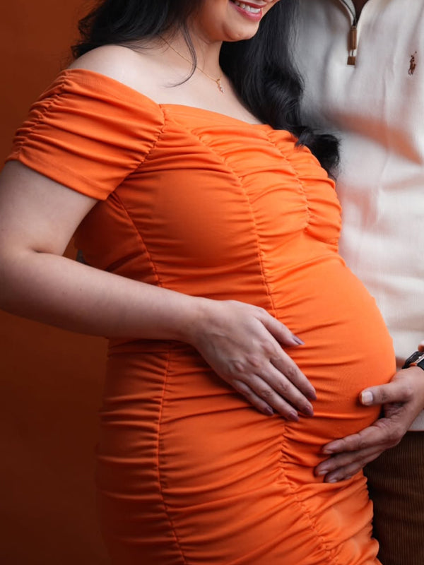 Momyknows Orange Off Shoulder Ruched Backless Maternity Photoshoot Midi Dress