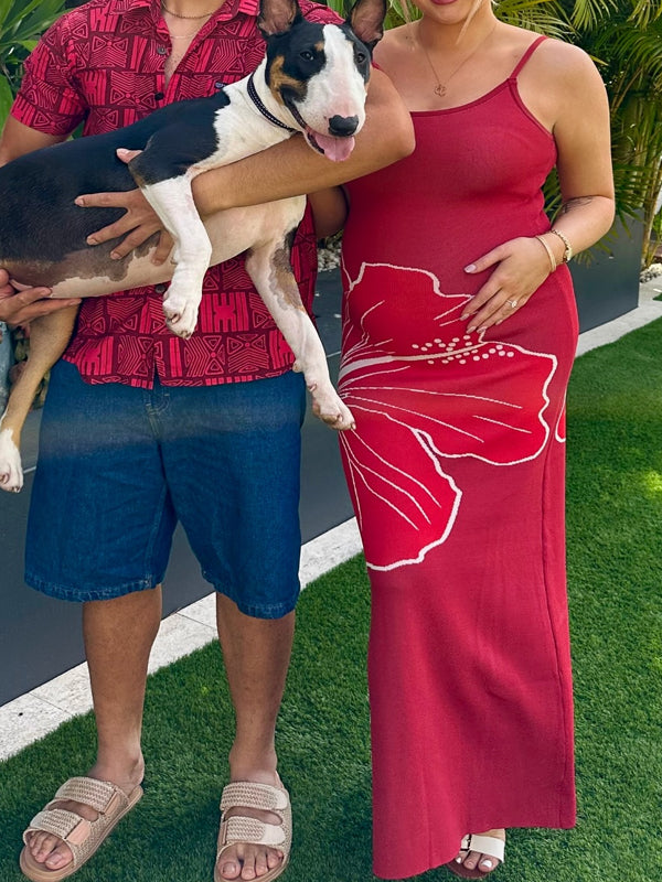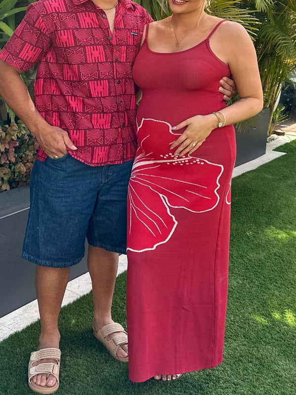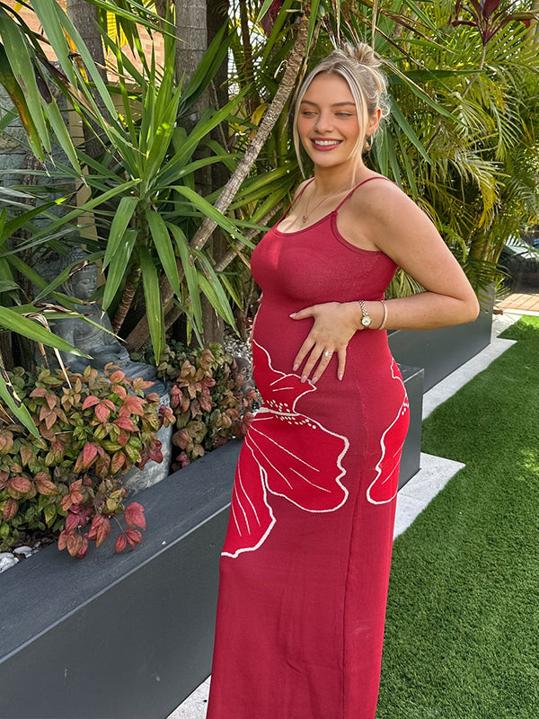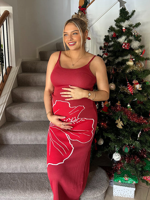 Momyknows Red Spaghetti Straps Print Backless Maternity Baby Shower Maxi Dress