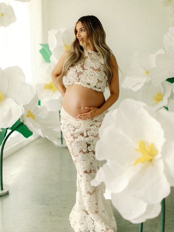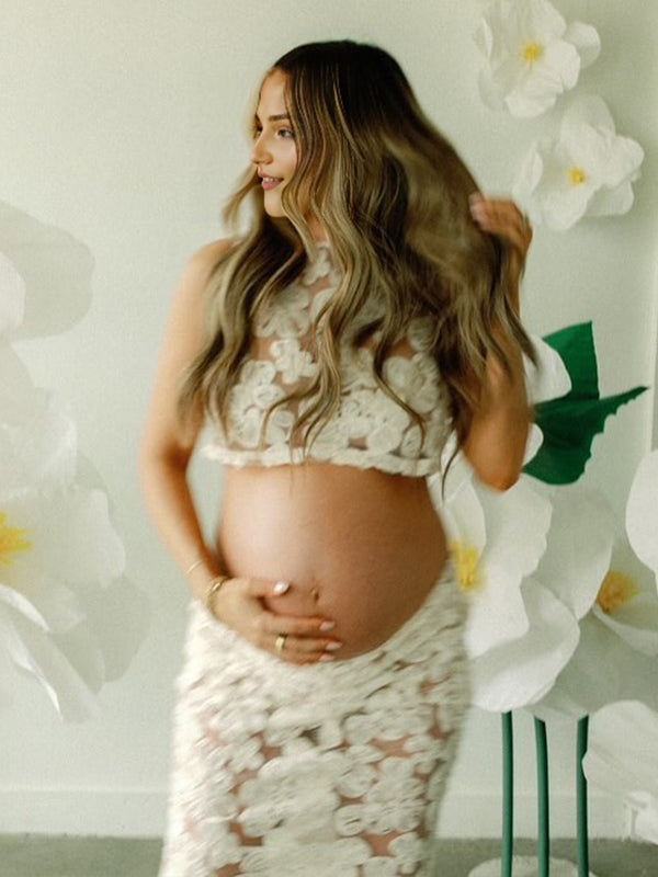 Momyknows White 3D Flower Lace Ruched Two Piece Maternity Baby Shower Maxi Dress