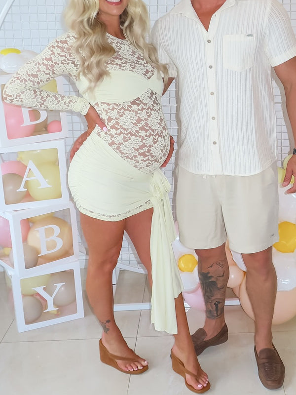 Momyknows Yellow Lace Ribbon Sheer Maternity Baby Shower Mini Dress