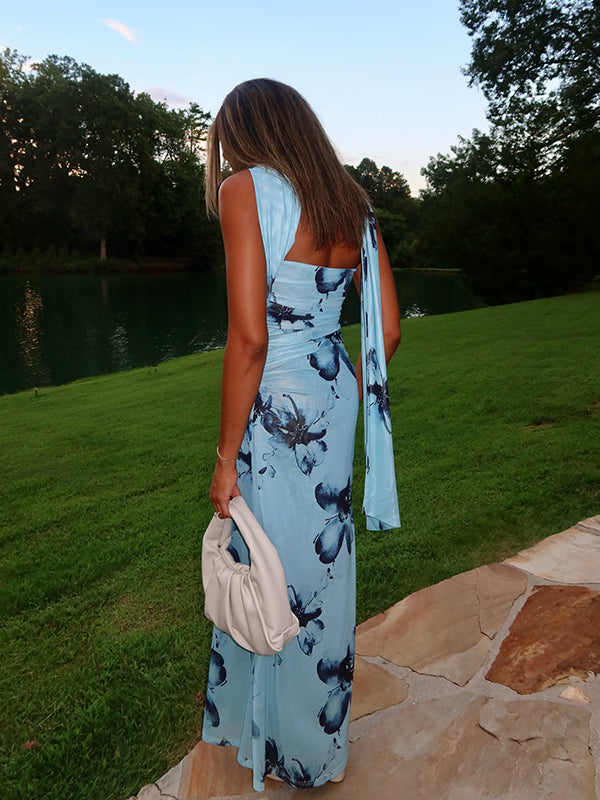 Momyknows Lake Blue Flowers Ribbons Bandeau Mermaid Baby Shower Maternity Maxi Dress