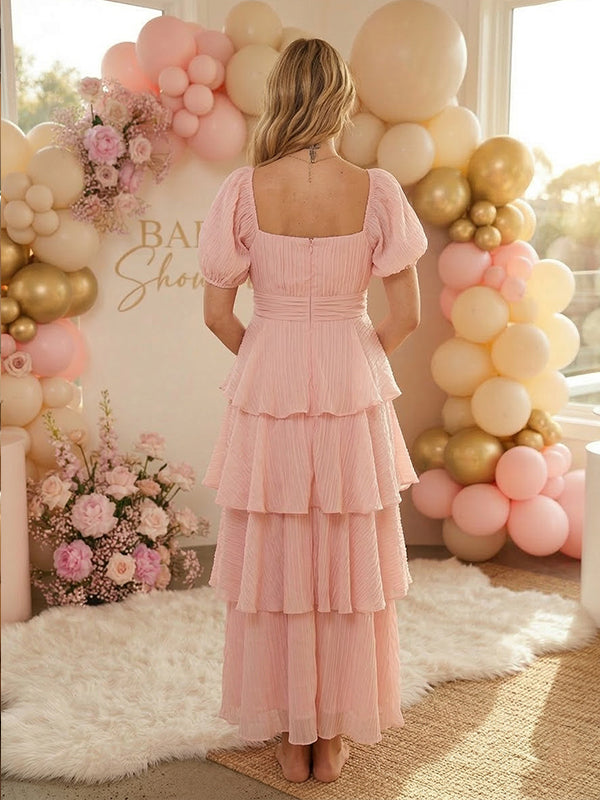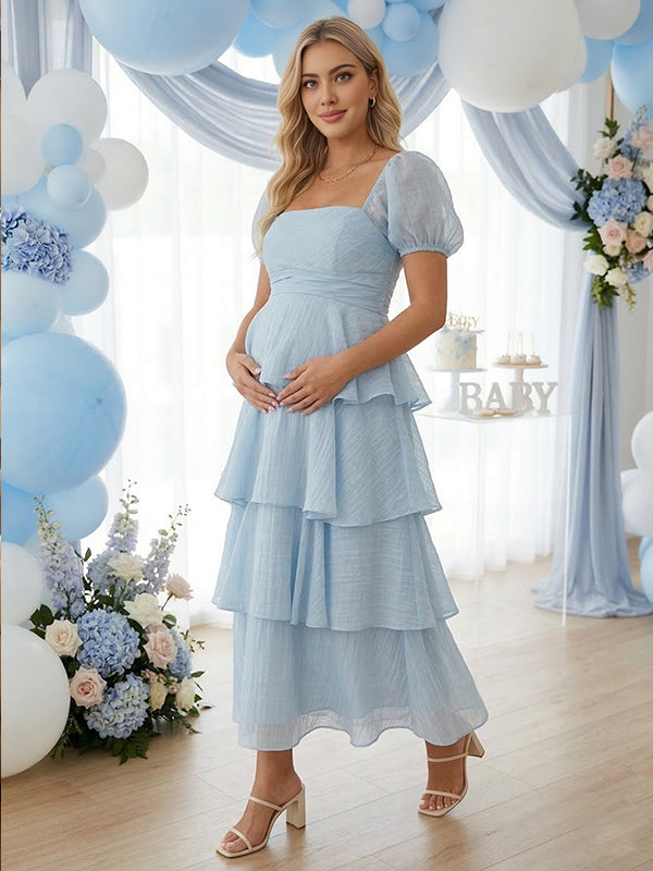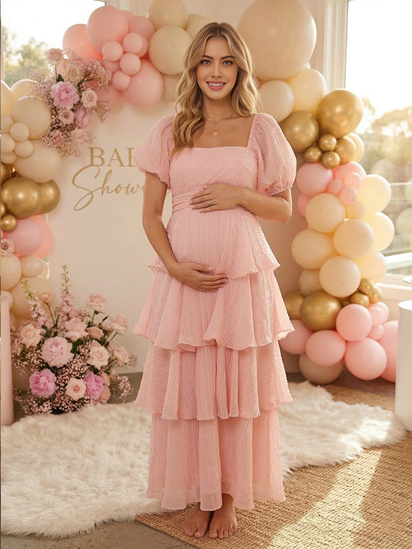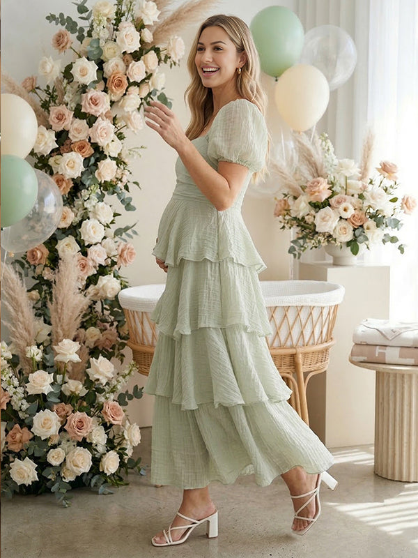 Momyknows Layered Ruffle A-line Square Neck Puff Sleeve Maternity Maxi Dress