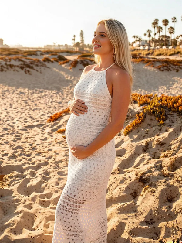 Momyknows Boho Striped Halter Neck Backless Patchwork Crochet Vacation Maternity Maxi Dress
