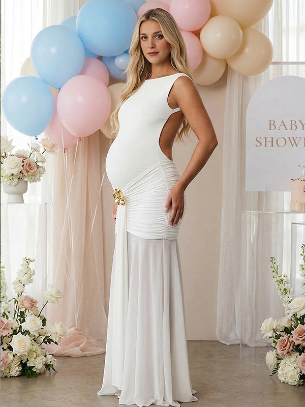 Momyknows Mesh Ruched Metal Hardwear Draped Backless Mermaid Maternity Maxi Dress