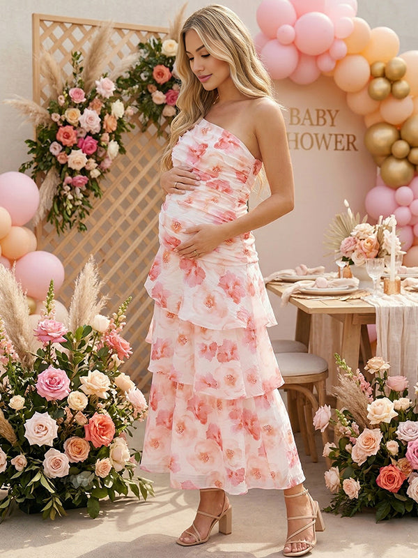 Momyknows Floral Layered Ruffle Ruched One Shoulder Bodycon Maternity Maxi Dress