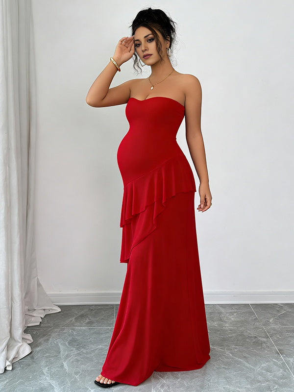 Momyknows Chic Cocktail Red Ruffle Bandeau Skater Maternity Maxi Dress