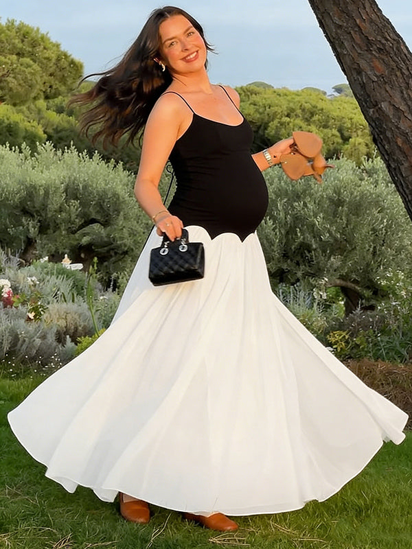 Momyknows Chic Black Spaghetti Straps Color Blocking Wavy Edge Cocktail Maternity Maxi Dress