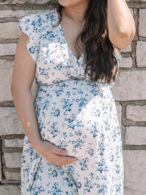 Momyknows Blue Floral Ruffle 2-in-1 Halter Neck Photoshoot Maternity Maxi Dress