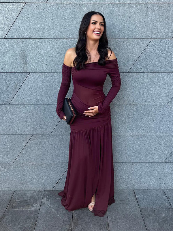 Momyknows Chic Wine Red Tulle Splicing Side Slit Ruched Off Shoulder Cocktail Maternity Maxi Dress