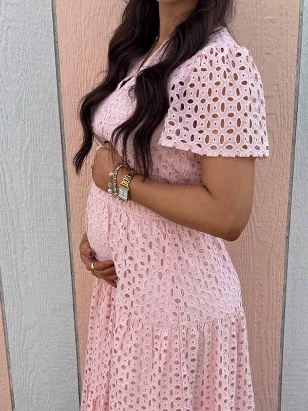 Momyknows Pink Hollow Out A-line V-neck Maternity Midi Dress