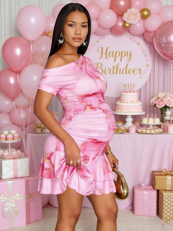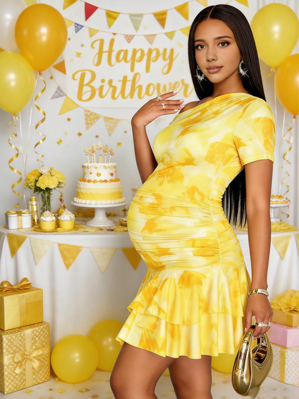 Momyknows Print Oblique Shoulder Ruched Maternity Baby Shower Mini Dress
