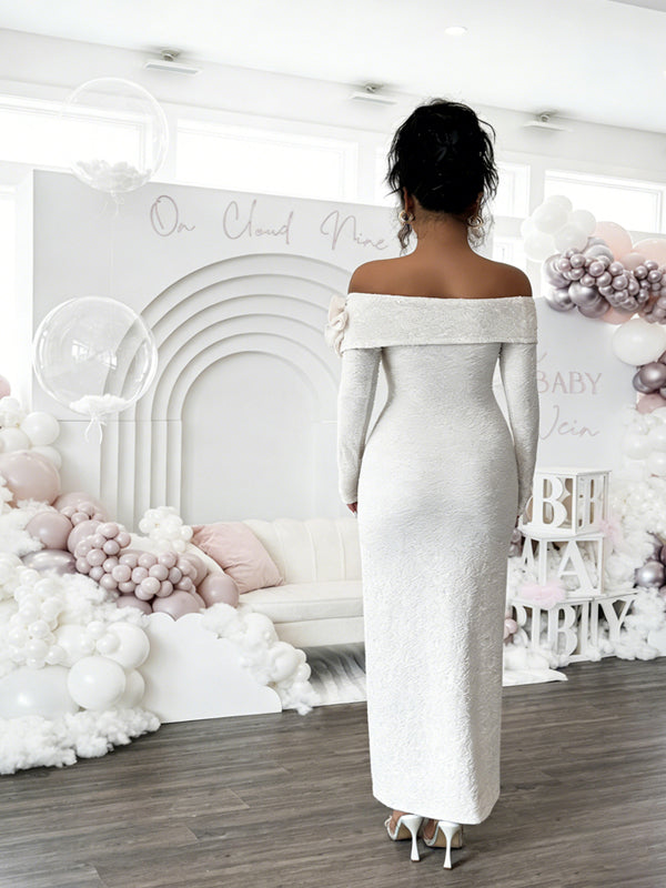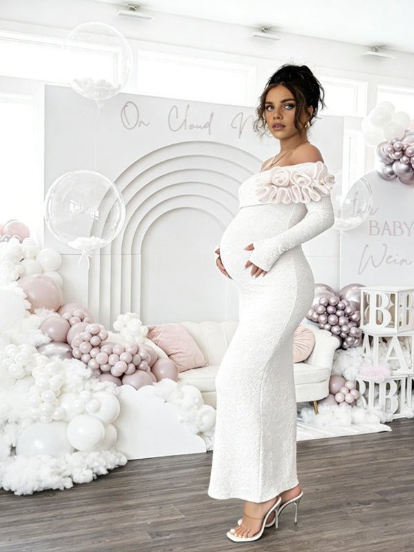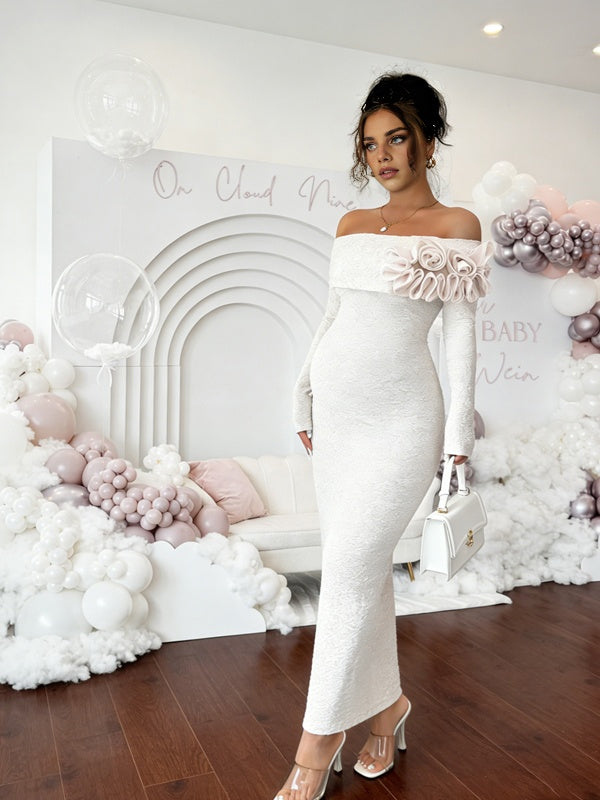 Momyknows Apricot Off Shoulder 3D Flower Backless Maternity Baby Shower Maxi Dress
