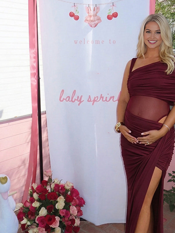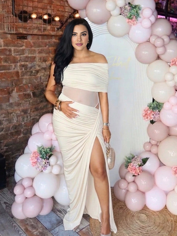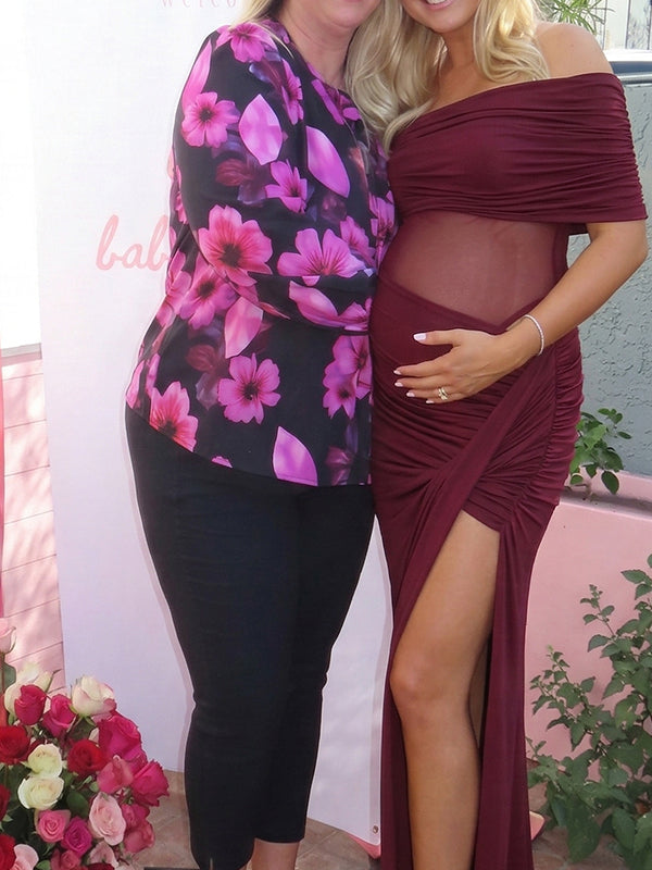 Momyknows One Shoulder Mesh Patchwork Ruched Side Slit Maternity Maxi Dress