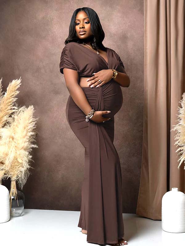 Momyknows Brown Crop Side Slit Ruched Maternity Photoshoot Maxi Dress