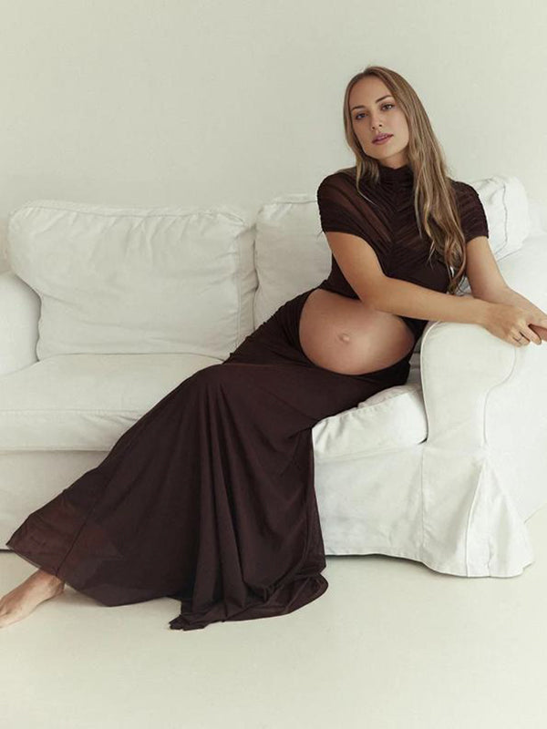 Momyknows Brown Mesh Ruched Ruffle Draped Two Piece Set Maternity Maxi Dress