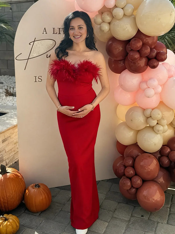 Momyknows Feather Off Shoulder Side Slit Bodycon Elegant Maternity Maxi Dress
