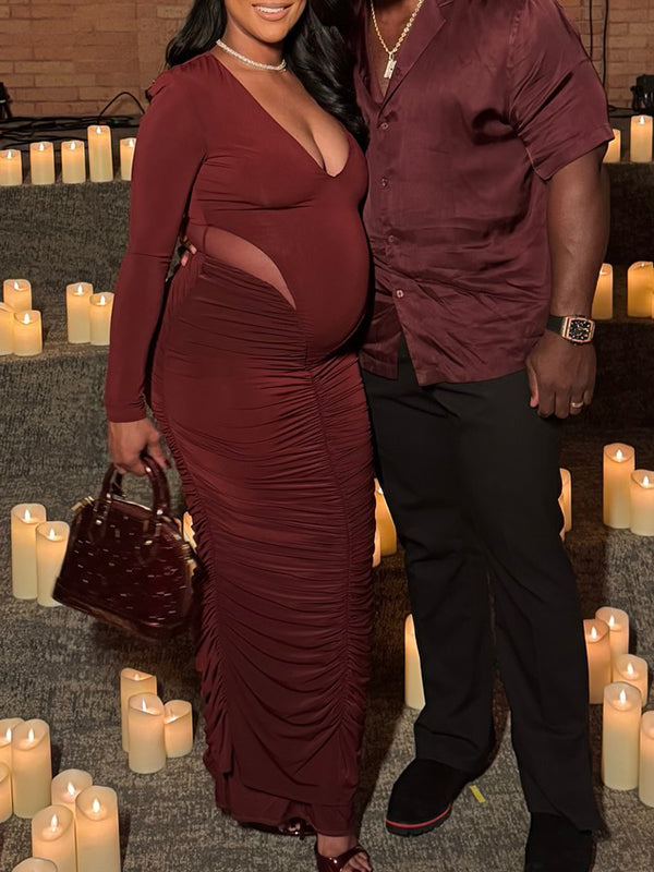Momyknows Burgundy Ruched Mesh Patchwork Deep V-neck Bodycon Maternity Maxi Dress