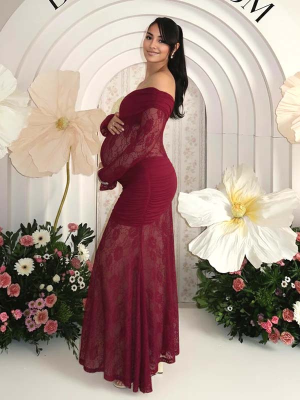 Momyknows Off Shoulder Lace Ruched Maternity Baby Shower Maxi Dress