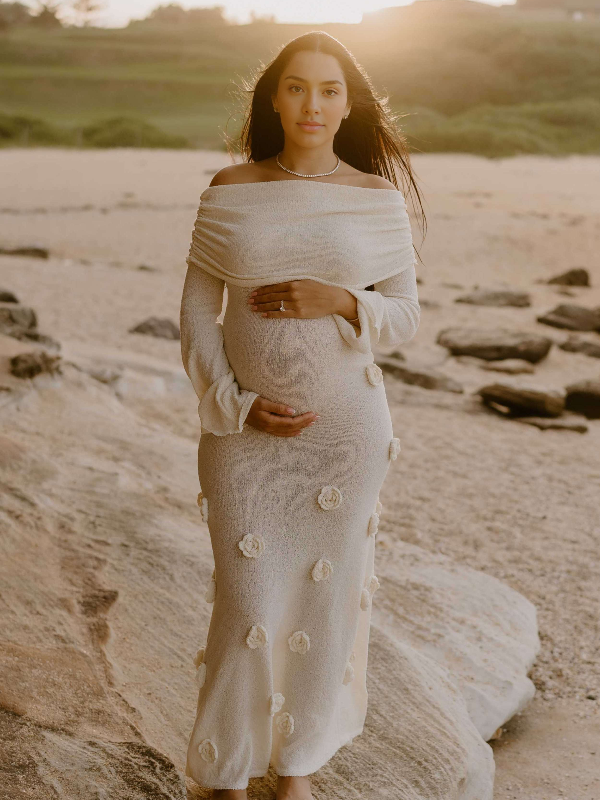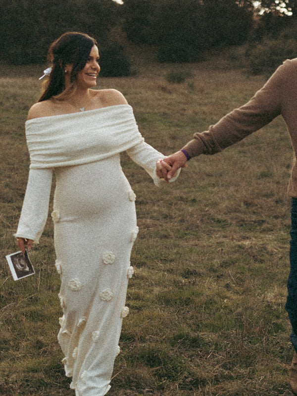 Momyknows White Off Shoulder 3D Flowers Knitting Sweater Photoshoot Maternity Maxi Dress