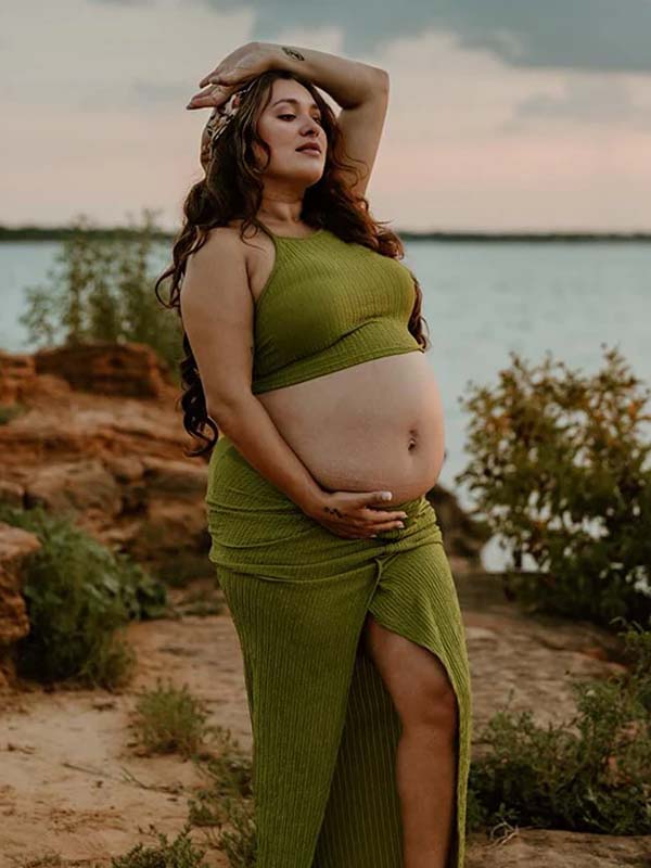 Momyknows Green Halter Neck Side Slit Two Piece Maternity Photoshoot Maxi Dress