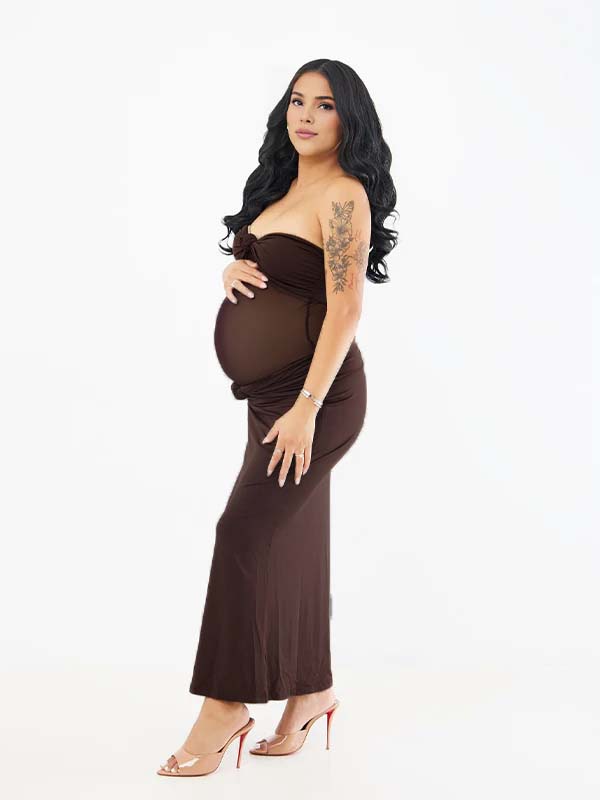Momyknows Brown Ruched Open Back Maternity Photoshoot Maxi Dress