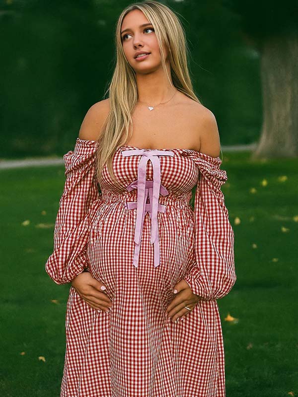 Momyknows Plaid Bow Off Shoulder Smocked A-line Boho Maternity Maxi Dress
