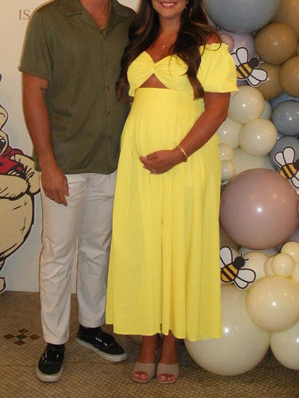 Momyknows Yellow Ruched Off Shoulder Cut Out Baby Moon Maternity Maxi Dress