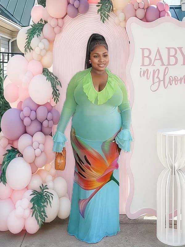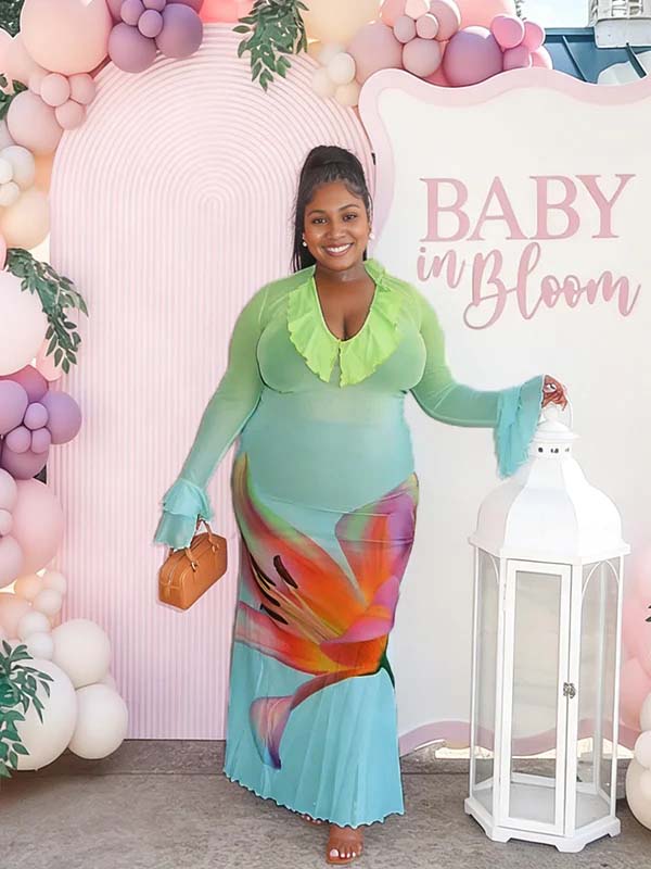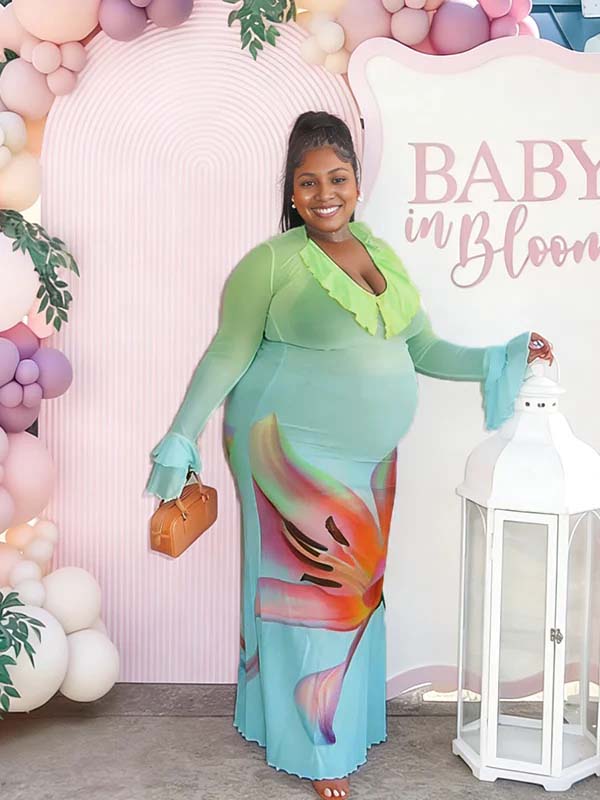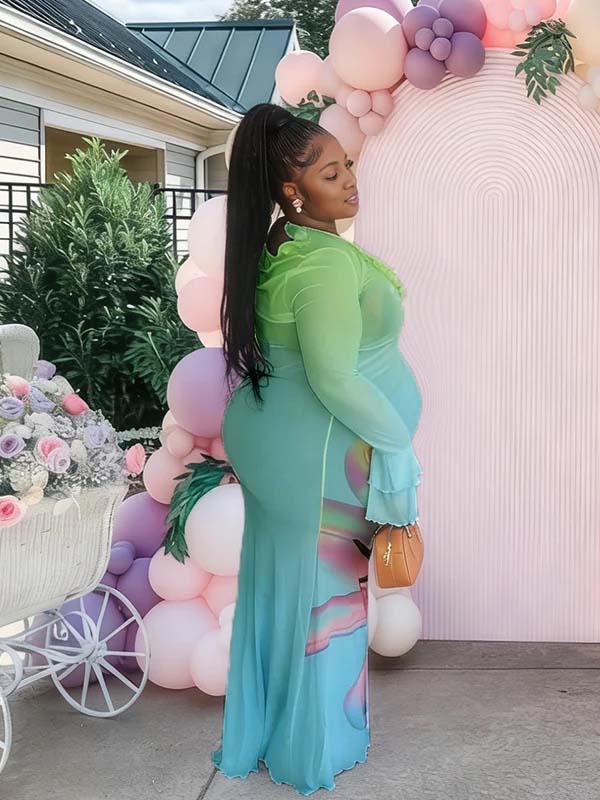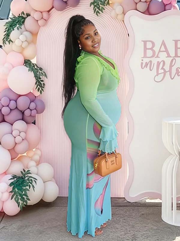 Momyknows Blue Print Mesh Falbal Gradient Color Maternity Baby Shower Maxi Dress