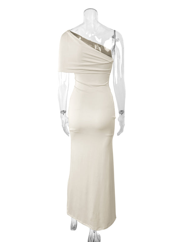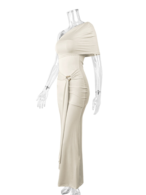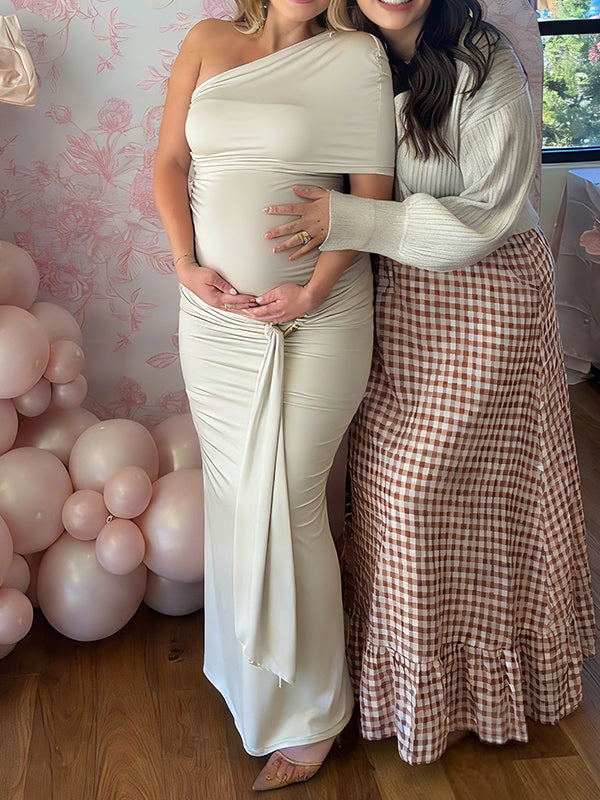 Momyknows Cream One Shoulder Ruched Metal Hardwear Draped Maternity Maxi Dress