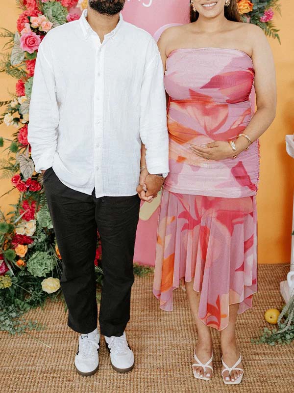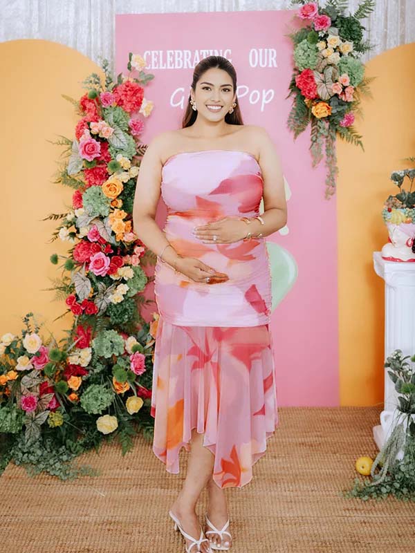 Momyknows Pink Floral Bandeau Irregular Baby Girl Shower Maternity Midi Dress
