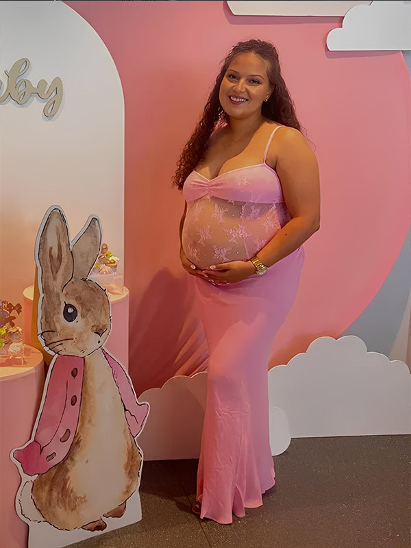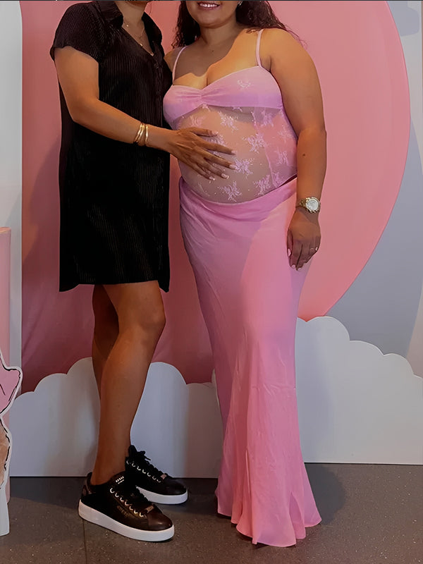 Momyknows Spaghetti Strap Sheer Lace Spliced Maternity Baby Shower Maxi Dress