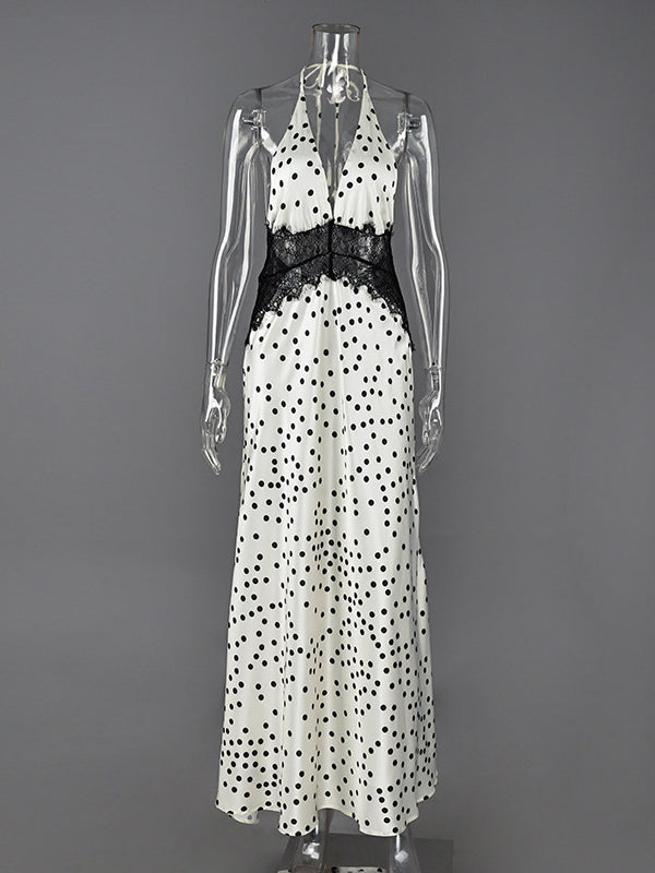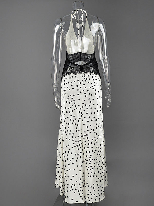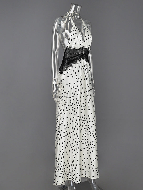 Momyknows White Polka Dot Lace Halter Neck Backless Maternity Maxi Dress