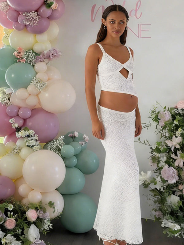 Momyknows White Spaghetti Strap Grid Crop Top Maternity Baby Shower Maxi Dress