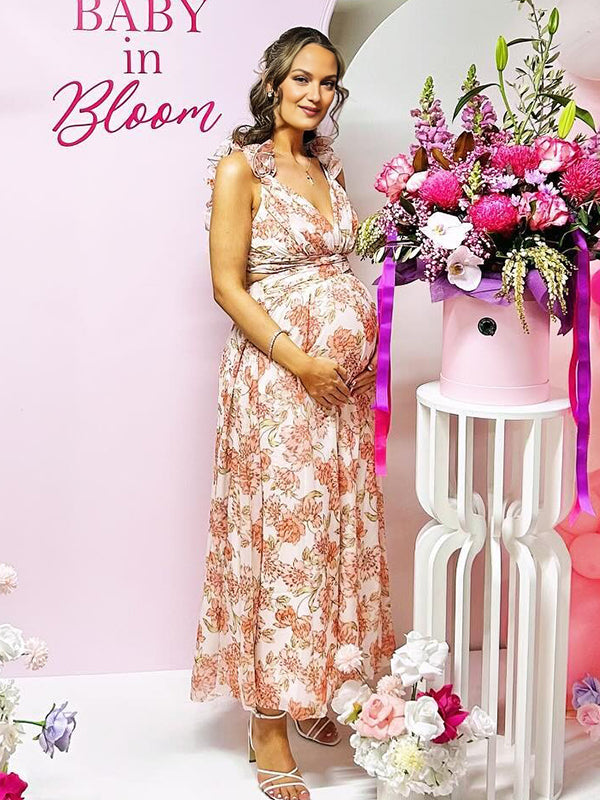 Momyknows Pink Print Cross Chest Open Back Maternity Baby Shower Maxi Dress
