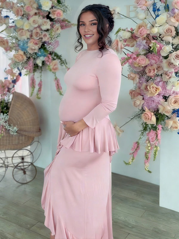 Momyknows Pink Ruffle Falbala Spliced Backless Maternity Baby Shower Maxi Dress