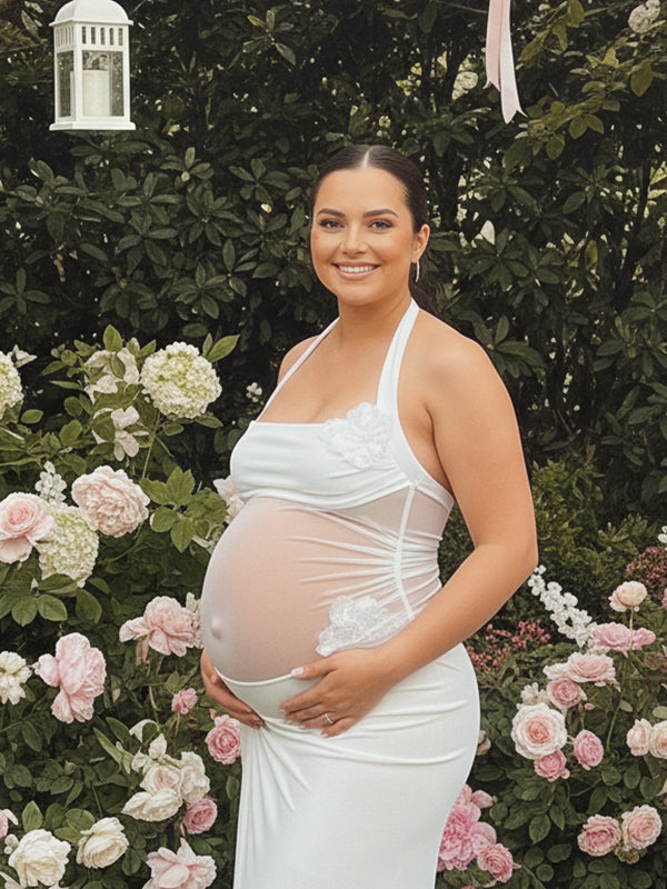 Momyknows Mesh Ruched 3D Flowers Backless Bodycon Elegant Maternity Maxi Dress