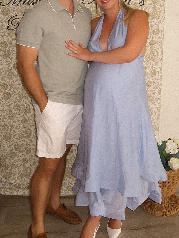 Momyknows Halter Neck Backless Ruched Lace Up Maternity Baby Shower Maxi Dress