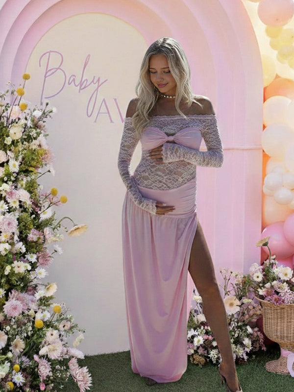 Momyknows Pink Lace Off Shoulder Cut Out Ruched Side Slit Maternity Maxi Dress